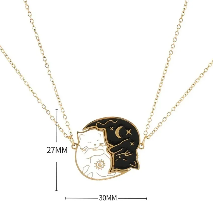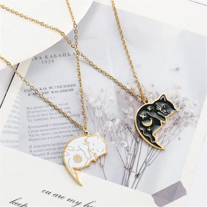 2Pcs Stainless Steel Black White Cat Necklace Love Embrace Cat Matching Couple Pendant Necklaces BFF Jewelry for Women Friend